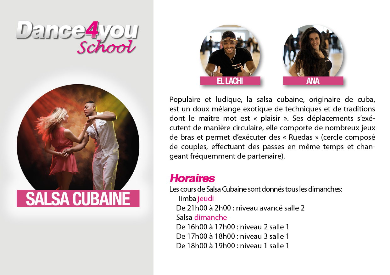 Très vite, l’école a évolué et lancé de nouveaux cours tels la Bachata, la Salsa cubaine, la Kizomba, le Boogie, ou encore le West Coast Swing. Grâce à la diversité de ses cours et son corps professoral d’experts passionnés, spécialisés dans leur discipline, « DANCE4YOU » se positionne comme l’école de référence en danses de couple.